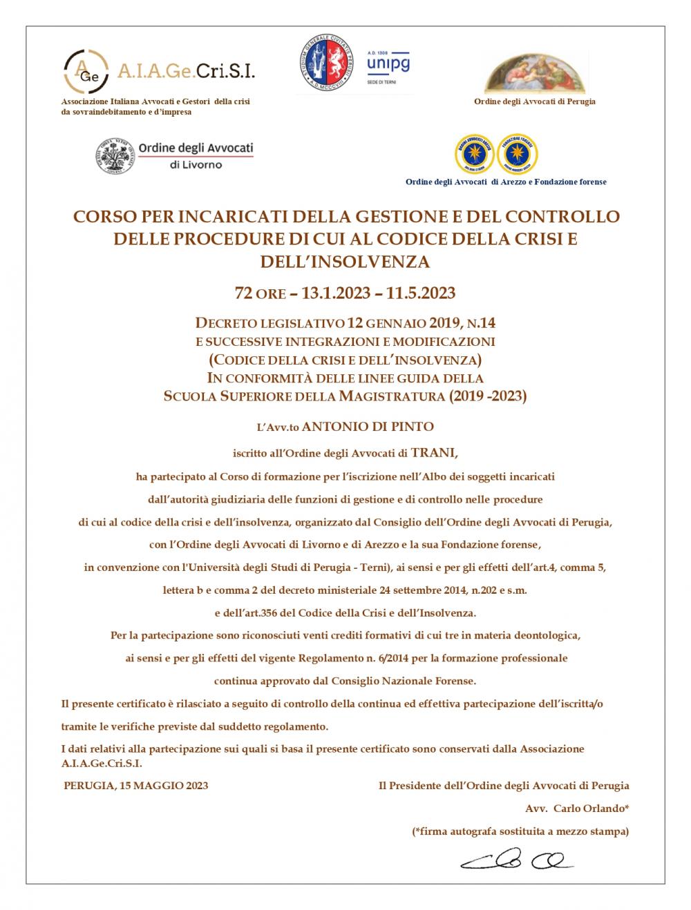 L′Avv. Antonio Di Pinto, già iscritto al Registro ministeriale quale gestore delle Crisi di Impresa, ha partecipato al Corso di formazione per la permanenza nellAlbo dei soggetti incaricati dallautori...